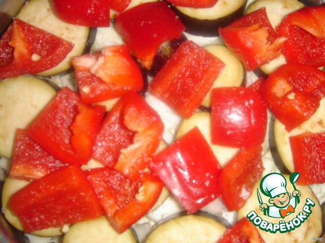 Дальше слой кабачков, желтый перчк и заключительный слой - помидорки.