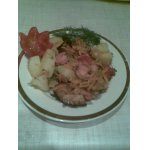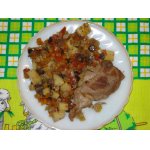 Когда блюдо готово, аккуратно, зачерпывая с низу, но не перемешивая, вылавливаем в тарелочку понемногу всех овощей, несколько кусочков мяса и посыпаем свежей зеленью петрушки. Звать никого не надо, все уже давно будут ждать этого момента на кухне!