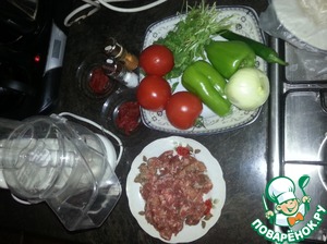 Начинку нужно измелчить в брендере. у кого нет брендера можно в мясорубке. После измелчения начинке добавляем томатную пасту и аджику и соль