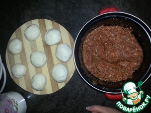 Тесто разделить на 8 частей. Раскатать тонко и на каждое тесто 2 ст. л начинки. Разогреть духовку на220 градусов. Тесто очень тонкое поэтому оно готовится на8 минут.