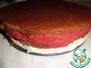 Вводим в массу половину желатина и перемешиваем (у меня это было около 75 мл).. Выкладываем её на корж, разравниваем...