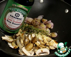 На сковороде нагреть растительное масло, положить нарезанные пластинками грибы, нарезанный полукольцами лук-шалот, тимьян, мелко нарезанный (или измельченный в чеснокодавилке) чеснок, перец и соевый соус. И тушить пока вся влага не испариться.