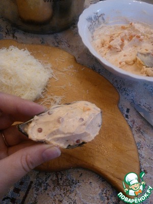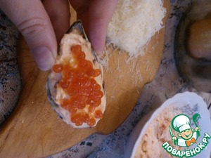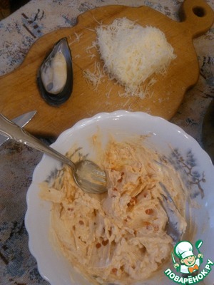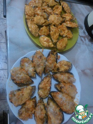 Я перед запеканием делаю так: подрезаю мидиям ножки, потом кладу их братно в раковины. Немного телодвижений, зато есть удобнее. И запекаю под грилем минут 5-7, не больше, пока сыр не расплавится. Может, и вам пригодится)