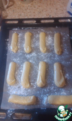Переложить тесто в кондитерский мешок и выложить полосочки по 10 см на пергамент, притрушенный мукой. Муки отложить немного из общего количества |