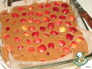 Форму выложить пекарской бумагой. Осторожно переложить тесто в форму. Сверху выложить черешню.
