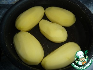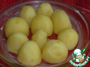 Огнеупорную форму смазать сливочным маслом. Картофель порезать пополам и поставить в форму на срез.