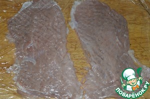 Мясо нарезать на кусочки, накрыть пленкой и хорошо отбить.