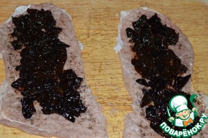 Отбитое мясо посолить и поперчить. Выложить начинку из чернослива.