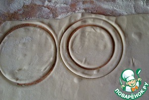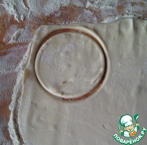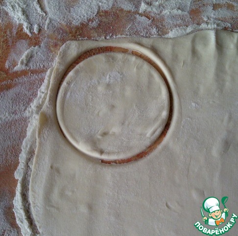 Разморозить тесто при комнатной температуре. Раскатать до 3 мм толщиной. Вырезать формой дно будущего волована (у меня чашка) круги.