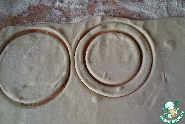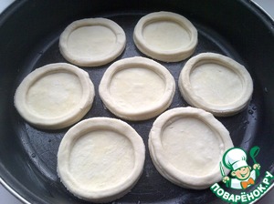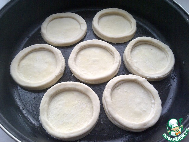 Для бортиков вырезать круг, таким же диаметром как и дно, а середину вырезать меньшей ёмкостью, что бы получилось кольцо. Выложить донышки на противень, смазанный маслом.
