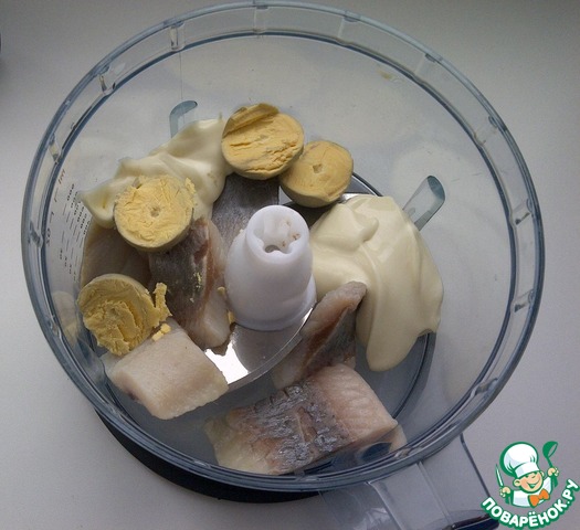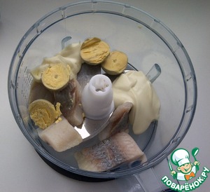 Теперь делаем пасту. Берём филе сельди (я не вымачивала, но лучше вымочит. Но это на мой вкус)Обсушить. Кладём в блендер. Туда же желтки сваренных в крутую яиц. Плавленный сыр.