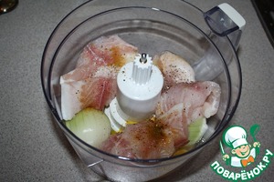 Филе рыбы, лук, чеснок, кусочек батона, соль, черный перец, яйцо сложить в блендер и измельчить