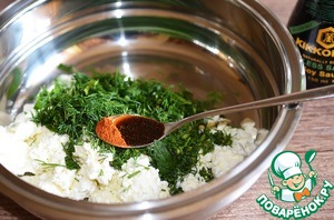 В творог добавьте мелко нарезанную зелень. Советую поэксперементировать с мятой. Я всегда стараюсь её добавить. Влейте соевый соус Kikkoman и добавьте паприку. Посолите по вкусу.