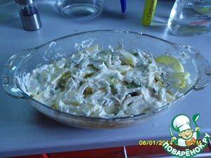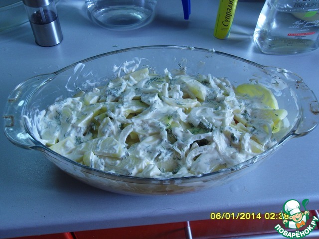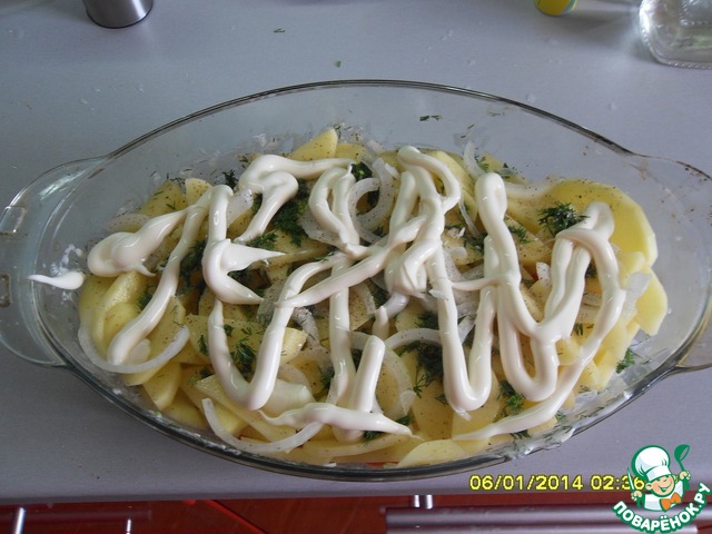 Выкладываем майонез! Только очень тонкий слой, так как овощи и мясо дадут много сока!