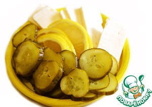Солёные огурцы, лимон и плавленный сырок нарезать. Так-же нарежьте на свой вкус болгарский перец.