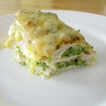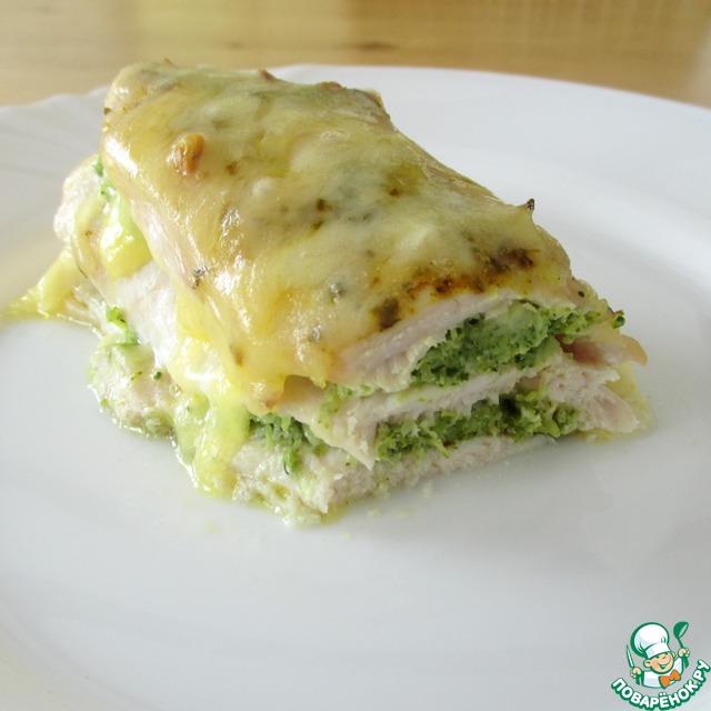 Далее выкладываем слоями на противень выстланный бумагой или фольгой: куриное филе, брокколи, сыр -