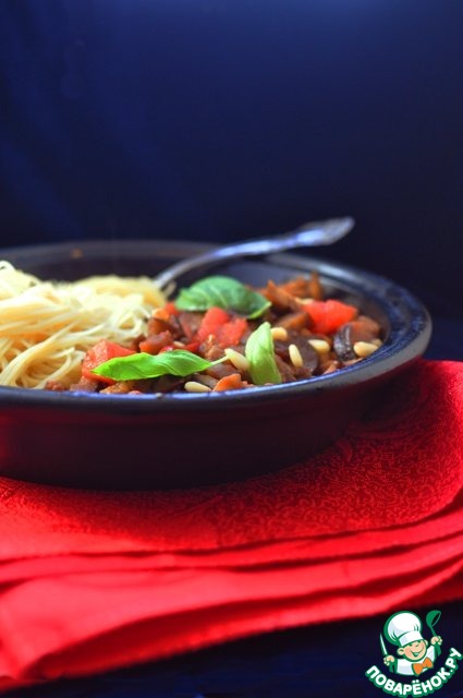 Паста с баклажанами, помидорами, кедровыми орехами и изюмом. Замечательная паста, слегка острая, немного сладкая и чуть пряная…