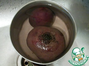 Тщательно моем свеклу и отправляем вариться до готовности (около 40 минут). Тыкаем ее ножичком, если мягкая, то сливаем воду и остужаем.