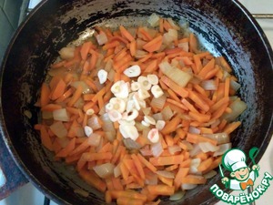 Режем чеснок тонкими пластинками, добавляем к зажарке, перемешиваем, держим на огне под крышкой еще 3 минуты и выключаем.