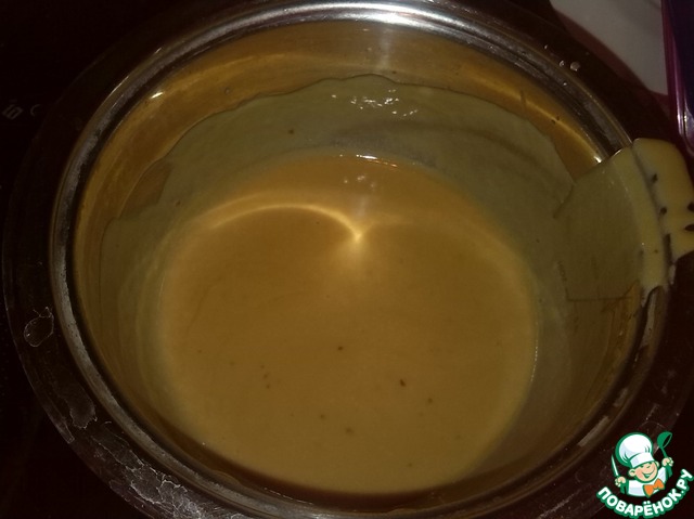 5. Пока торт остывает, займемся кремом: 1 стакан сметаны смешать с 1 стаканом сахара, добавить по вкусу растворимый кофе и прогреть, помешивая, довести до кипения, но не кипятить, добавить 50 гр сливочного масла. Крем хорошо взбить.