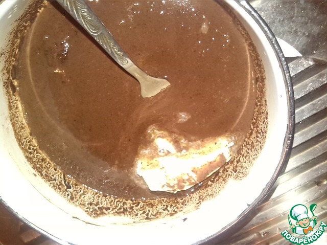 7. Готовим глазурь: 1 ст. ложка какао, 1 ст. ложка сметаны, 1 ст. ложка сахара, 1 ст. ложка сливочного масла - все разогреть, хорошо растереть до однородной консистенции.