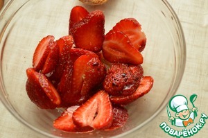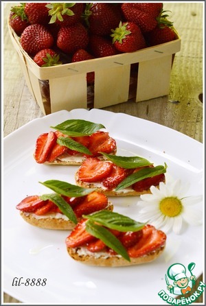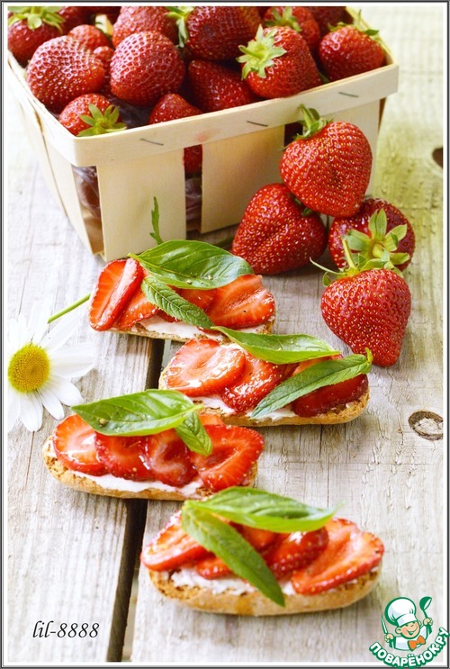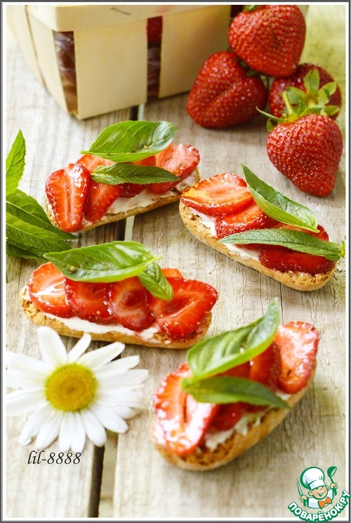 Тем временем багет подсушить на сухой сковороде или в духовке. Каждый ломтик намазать сыром, а сверху выложить пластинки клубники. Сверху можно украсить листочками мяты.