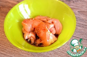Для начинки (шаг 1) куриное филе нарежьте полосками и замаринуйте в 2 ст. л. соевого соуса Kikkoman.