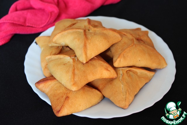 Делим тесто на части, катаем шарики. Каждый шарик раскатываем, выкладываем на тесто начинку, защипываем квадратиком.