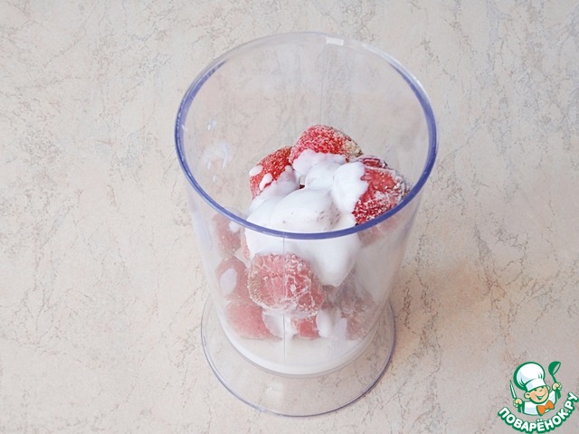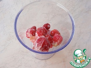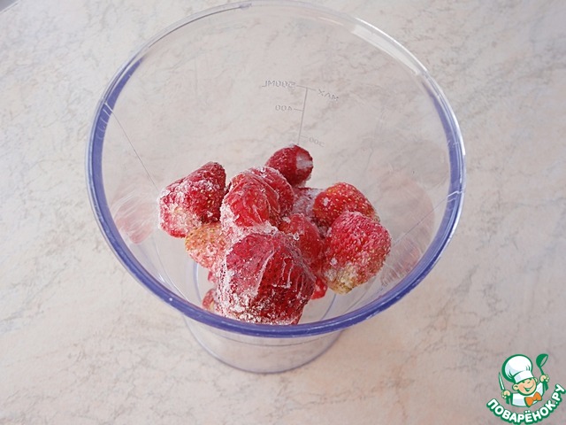 Клубника нужна непременно замороженная. Высыпаем ее в емкость для взбивания.