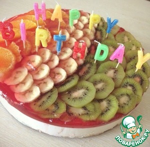 Пока все стынет, заливаем фруктовое желе, для более упругого желе воды наливаем вдвое меньше, чем написано на упаковке, в моем случае на 2 пачки желе пошло 400 мл воды. Нарезаем фрукты для украшения, раскладываем их на торт.