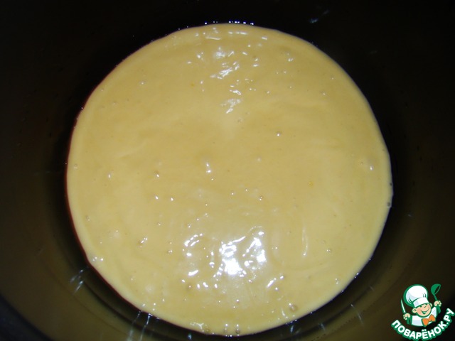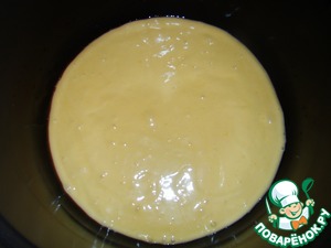 Выкладываем половину теста в смазанную растительным маслом чашу мультиварки. Разравниваем.