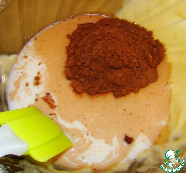В оставшуюся часть теста добавляем какао-порошок и молоко.