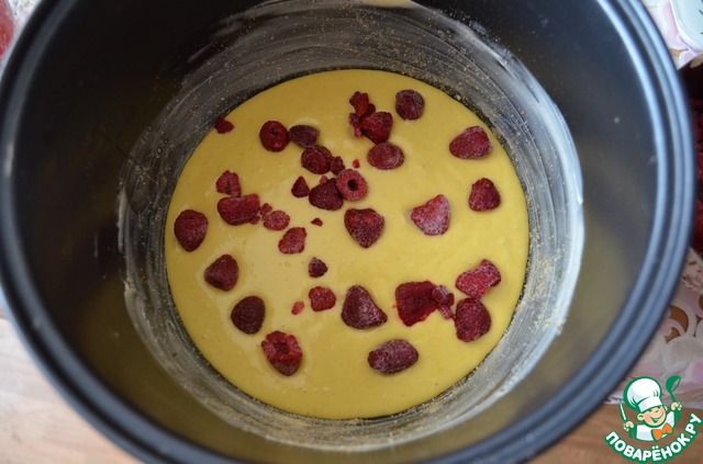 Смазываем чашу мультиварки маргарином (можно слегка присыпать ее манной крупой или панировочными сухарями). Выливаем часть теста, на него выкладываем малину. Повторяем эти слои (два-три слоя), пока не закончится тесто и малина.