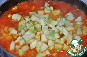 Лук и чеснок измельчить, обжарить на растительном масле. Добавить порезанные кубиками помидоры, готовить до мягкости. Добавить порезанный перчик чили. Авокадо очистить, сбрызнуть лимонным соком, порезать кубиками и добавить к овощам, перемешать, тушить 3-5 минут.