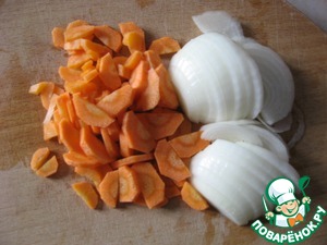 Пока картофель варится, готовим зажарку: нарезаем лук и морковку