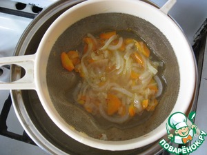 На кастрюльку ставим друшлаг и в него перекладываем готовую зажарку. После того, как зажарка отдаст свой "сок", ее можно выбросить.