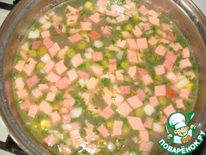 Затем добавляем колбаску (это может быть нарезанная кусочками сосиска, копченая колбаска или мясо, можно даже использовать набор для солянки) и зелень, солим, перчим по вкусу. Варим 5 минут, и супчик готов.