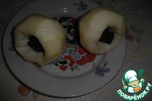 2. Очищаем груши от кожуры и удаляем из них зерна через основание. Сбрызгиваем лимонным соком. В каждую грушу вкладываем по кусочку шоколада.
