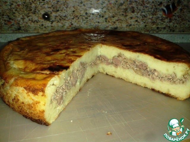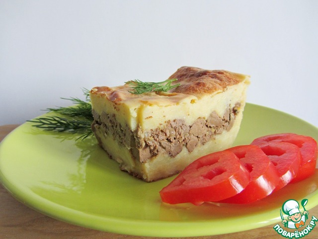 В смазанную маслом жаропрочную форму (26 см) выложите половину картофельного теста, положите слой начинки из куриной печенки