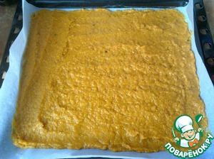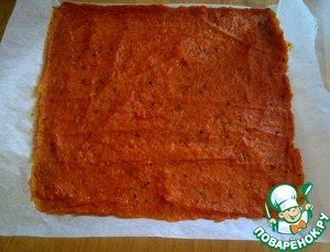 На противень положить бумагу для выпечки, смазать её растительным маслом слегка. Выложить пасту из кураги тонким слоем и поставить в духовку. Я подсушивала при 100 градусах долго (у меня духовка с обдувом)))