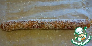 Не сильно придавливая рулетик, обвалять в кокосовой стружке. (можно слегка смочить лимонным соком перед этим)
