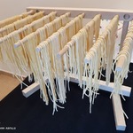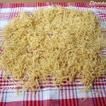Делим тесто на две части и раскатываем в листы толщиной 1 мм. На полчаса оставляем их подсохнуть. Затем нарезаем тесто на лапшу нужной длины и ширины. Готовую лапшу распределяем по столу и оставляем так до полного высыхания.