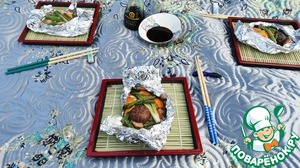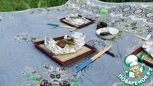 Для этого блюда (японское название сака-муси) овощи и лососину заворачивают в фольгу и готовят на пару, на гриле, в духовке или на углях на решётке мангала в собственном соку с добавлением саке и соевого соуса. Чтобы красиво разложить в пакетиках из фольги рыбу и овощи, нужно будет потрудиться, зато, раскрыв пакетик, вы увидите нечто прекрасное, как летний сад. Такой способ приготовления - без капли масла, делает это блюдо совершенным для здорового питания.