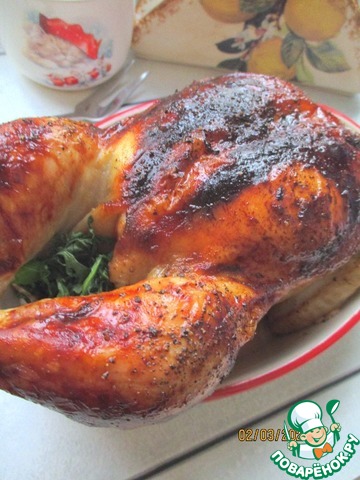 Натираем медово-горчичной смесью курицу внутри и снаружи, вкладываем в брюшко зелень. Посыпаем свежемолотым душистым перцем. Даём постоять 2 часа при комнатной температуре.