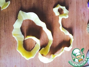 Чистим картошку от кожуры. Моем. Затем точно такими же движениями, как и при чистке, круговыми движениями обрезаем картошку в спиральную цельную полосочку. Желательно из одной картофеленки сделать одну завитушку, но если где-то порвется наша завитушка - ничего страшного.