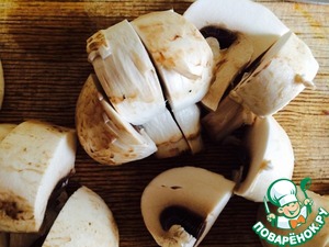 Грибочек режем на 4 части. Заливаем кипятком и даем постоять под крышкой минуты 3.