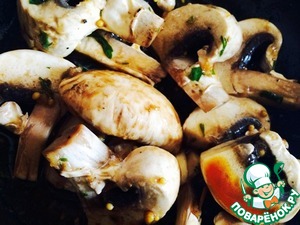 Добавим к грибам соевый соус (я еще немного зелени и горчицы добавила). Пусть постоит еще минут 5.