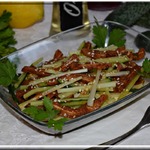 Сельдерей нарезать тоже соломкой. Немного сельдерея оставить для заправки.