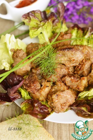 6. Выложить мясо к луку, перемешать. Если хотите мясо с дымком, то можно поджечь сухую веточку розмарина, или специальную щепу, положить к мясу, накрыть крышкой и через несколько минут будет самый настоящий, ароматный шашлык. В казан, где готовили мясо можно влить стакан воды, довести до кипения, соскребая жареный лук со стенок и затем приготовить вкусный соус.