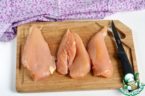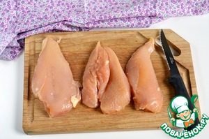 Подготовить куриные грудки. Разрезать их пополам вдоль, чтобы они были не слишком толстыми.